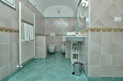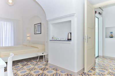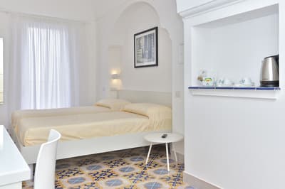L’ensemble est dans un style de décoration artistique avec un mobilier de style méditerranéen, des sols décorés avec des carreaux peints à la main de Vietri sul Mare et se complète dans une dominance de blanc. La chambre est dotée de deux lits simples et la salle de bains privative décorée de céramiques vert pastel peintes à la main à Vietri sul Mare est équipée d'une baignoire à remous. Le tout dans une ambiance apaisante !