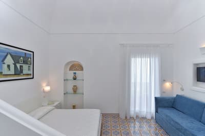 L’ensemble est dans un style de décoration artistique avec un mobilier de style méditerranéen, des sols décorés avec des carreaux peints à la main de Vietri sul Mare et se complète dans une dominance de blanc. La chambre est dotée d’un lit double et la salle de bains privative dispose d'une douche spacieuse et arrondie avec un carrelage bleu vif. Le tout dans une ambiance apaisante !