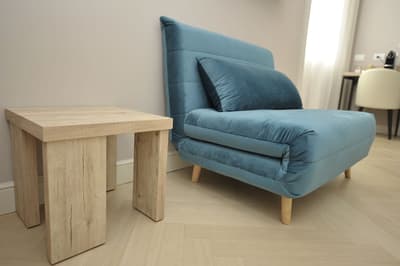 L’ensemble est dans un style plutôt minimaliste avec un mobilier en pin clair, un sol carrelé effet parquet et se complète dans des tons taupes. La chambre est dotée d’un lit double et la salle de bains est équipée d’une douche. Ambiance relaxante !