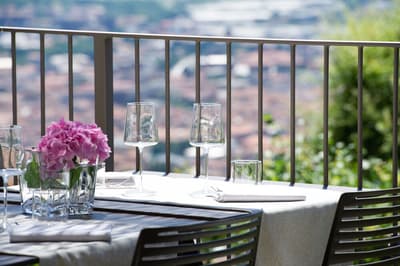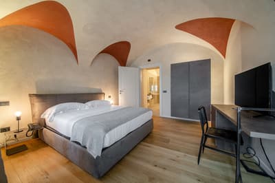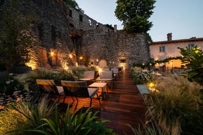 Prenez de la hauteur et partez vous réfugier dans le Relais San Vigilio al Castello ! Vous êtes sur la sublime colline de San Vigilio. Alors oui, il faut circuler dans des rues étroites et l’accès au parking est un peu délicat... Mais la récompense une fois arrivé sur place sera au-delà de vos espérances! Le charme de cet hôtel envoûte totalement, avec ses vieilles pierres millénaires et les tours massives de l’ancien château qui se dressent autour. On est totalement plongé dans l’univers historique de la ville avec tout son souffle de dolce vita. Les toits de Bergame s’étendent sous vos pieds. Vous n’allez plus vouloir décoller de cette terrasse sublime bordée de pins et de vignes centenaires, sous cette tonnelle en fer forgé, ou du jardin suspendu qui se trouve juste en dessous. Un royaume d’apaisement et de ressourcement en pleine ville ! Et dans les chambres, on retrouve tout le caractère de la bâtisse avec les poutres apparentes, parquets en bois et le luxe de l’authenticité. Rien de trop. Du raffinement à l’état pur. Certaines pièces, comme celle du resto, sont voûtées, avec plusieurs arches blanches entourées de briques chaudes qui créent une atmosphère ultra-réconfortante. Installez-vous dans le coin lecture au coin de la cheminée, et laissez-vous porter par l’énergie du lieu. Avant de déguster un merveilleux spritz commandé au bar recouvert de marbre noir. Avec la photo souvenir qui va bien, au coin du feu ou dehors avec ce panorama de rêve. Et la nuit, les arbres s’illuminent de 1000 lumières et rendent l’environnement encore plus magique ! Le rêve pour un dîner romantique à l’italienne. Bref, on ne peut que vous conseiller de vous échapper, pour une excursion en amoureux, dans cet hôtel de seulement 9 chambres ultra-intimistes. Inoubliable.
