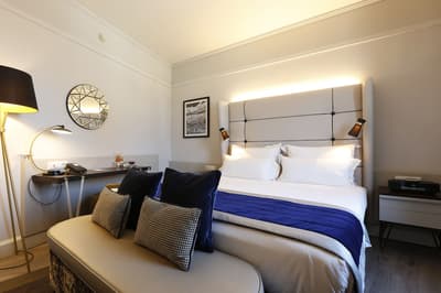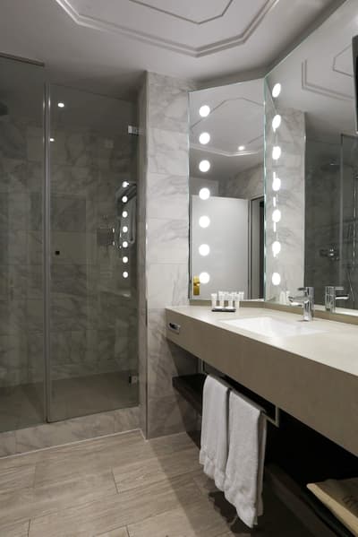 Dans un style de décoration contemporaine et soignée, elle arbore un beau parquet, un mobilier tendance et se complète dans une dominance de blanc. La chambre est dotée d’un lit confortable et la salle de bains en marbre est équipée d’une douche et des produits Roberto Cavalli gratuits et est accessible en fauteuil roulant. Le tout dans une ambiance zen !