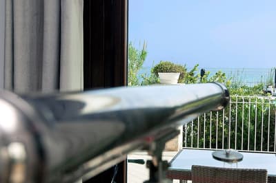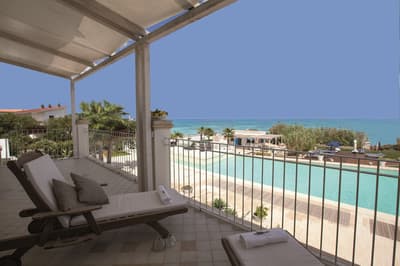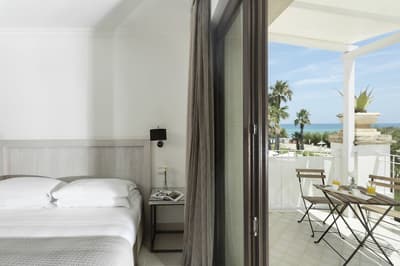 Cette chambre supérieure peut offrir une vue partielle sur la mer ou sur le jardin et se situe au premier étage. Elle dispose d’un balcon privé équipé de tables basses et de chaises pour se détendre, prendre l’apéritif tout en profitant du soleil.