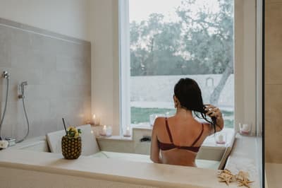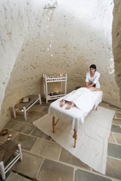 Lâchez prise ! Vous êtes à l’AgriResort Masseria Muntebianchi, un lieu à la philosophie green où vous pouvez vous concentrer sur votre bien-être. Le cadre est ultra-chic, conciliant tradition et luxe. Le terme Agri évoque le lien avec la région du Salento et ses produits typiques, tandis que "Resort" est synonyme de confort moderne, de cadre raffiné. Cet endroit, il est à l’image des hôtes, Antonio et Giuseppina, qui ont voulu concilier leurs deux passions : l’hôtellerie et l’amour du terroir. Issue d’une famille de producteurs d’huile d’olive, Giuseppina continue la tradition. Le domaine Muntibianchi a même un label de production bio et vous pouvez déguster l’huile Biolin produite sur place ! Structuré comme un véritable petit bourg, l’AgriResort vous accueille sur sa piazza centrale, devant la structure abritant la réception avec son plafond voûté et sa cheminée en pierre de Lecce. Vous êtes tout de suite envoûté par la beauté du lieu, dont les murs blancs immaculés se détachent sur le bleu du ciel et le vert du jardin environnant. Prenez la petite passerelle entourée d’oliviers et vous découvrirez deux attrayantes piscines d’eau salée, dont une chauffée à 33° avec bains à remous ! Juste derrière, se cache une petite grotte… Surprise : c’est la salle de massage et relaxation ! Et en fin de journée, passage obligé au pool bar où on déguste des cocktails extra ! #InstaHappy