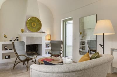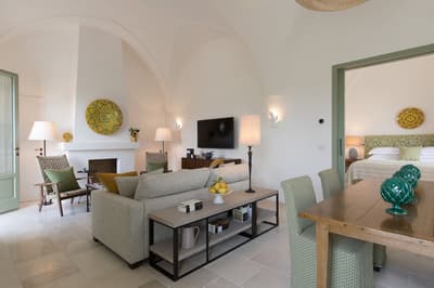 L’ensemble profite d’un décor qui allie avec élégance les caractéristiques originales de la ferme avec un magnifique plafond voûté, des touches de design contemporain, des objets d'art locaux, d'élégants meubles en bambou et de lampes en rotin atmosphériques. La chambre est dotée d’un lit confortable et la spacieuse salle de bains en pierre de Trani locale est équipée d’un double lavabo et d’une douche à l’italienne. Le tout dans une atmosphère idyllique !