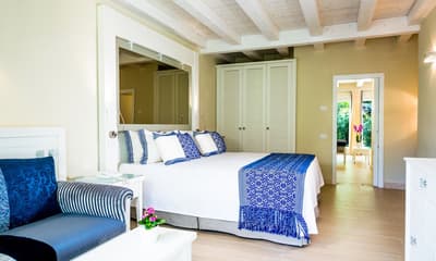 Conçue de 2 chambres communicantes, elle est très spacieuse et confortable. Sa terrasse est aménagée d’une petite table à manger et d’un lit de séjour pour apprécier la tranquillité des jardins. Elle baigne dans une atmosphère sereine et reposante. Idéale pour les familles, elle procure intimité. Elle a tout le nécessaire pour un séjour confortable et agréable. Salle de bain avec baignoire et douche.