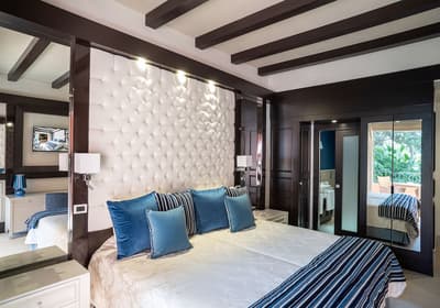 Dominée de blanc, elle est d’un style moderne et contemporain. La grande baie vitrée laisse pénétrer la lumière naturelle pour une pièce lumineuse et accueillante. Son ensemble en bois la rend exotique et harmonieuse. Quelques touches de bleu rappellent la mer.