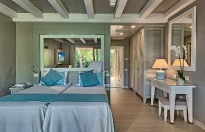 Conçue de 2 chambres communicantes, elle est très spacieuse et confortable. Sa terrasse est aménagée d’une petite table à manger et d’un lit de séjour pour apprécier la tranquillité des jardins. Elle baigne dans une atmosphère sereine et reposante. Idéale pour les familles, elle procure intimité. Elle a tout le nécessaire pour un séjour confortable et agréable. Salle de bain avec baignoire et douche.