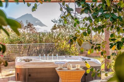 Spacieuse, elle est située au premier et deuxième étage et dispose d’un grand balcon couvert et équipé pour profiter du jardin luxuriant, du panorama et pour prendre un bon petit-déjeuner ou faire un diner romantique aux chandelles. À noter qu’elle est également disponible côté piscine avec supplément.