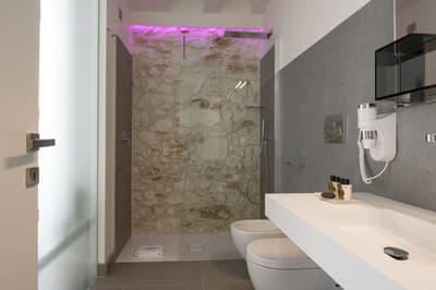 Meublée dans un style moderne, elle comporte des murs en pierre vivante, des voûtes décorées à la main, un stuc vénitien et des éléments de design. La chambre est dotée d’un lit de taille régulière et la salle de bains est équipée d’une douche. Le tout dans une atmosphère cosy !