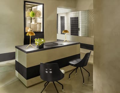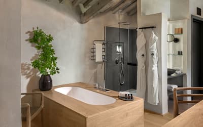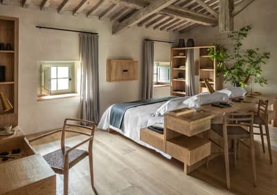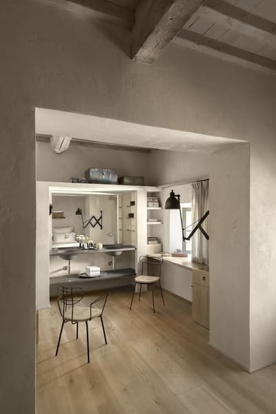 L’ensemble est dans un style de décoration contemporaine et charmante avec un parquet italien non traité, des meubles artisanaux uniques, un plafond avec poutres d'origine et des objets et luminaires design. La chambre est dotée d’un lit king avec matelas orthopédique et la salle de bains est équipée d’une baignoire autoportante, d’une douche en pierre artisanale avec tête de pluie et deux éviers en pierre fabriqués à la main séparés. Ambiance cosy !