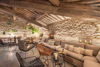 Unique, elle reflète l'originalité de ce bâtiment historique et offre une vue imprenable sur les oliveraies ou sur les bois que vous pourrez contempler en toute intimité, tout en sirotant votre boisson préférée.