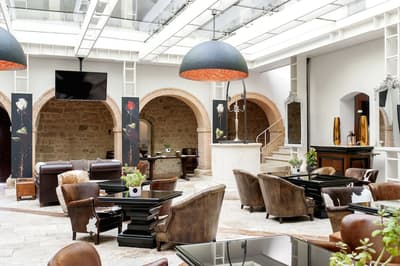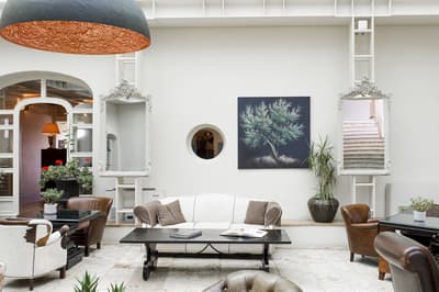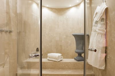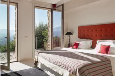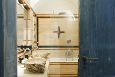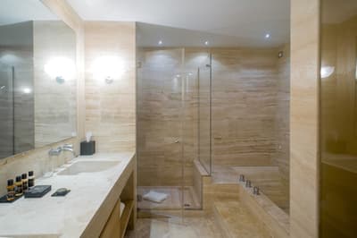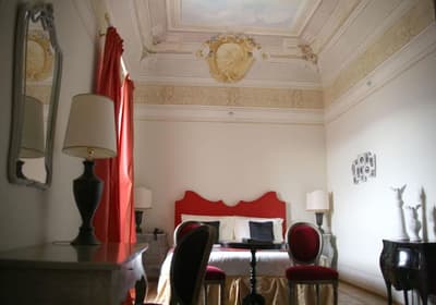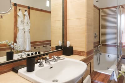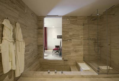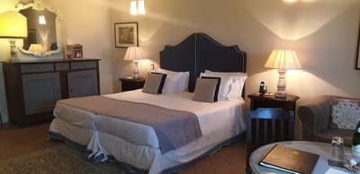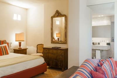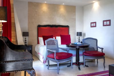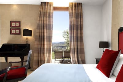 Elle peut présenter des éléments architecturaux caractéristiques de la structure d'origine tels qu’un sol en terre cuite et un mobilier de style château traditionnel. La chambre est dotée d’un lit en fer forgé et d’un confortable matelas Simmons et la salle de bains en marbre peut être équipée d'une douche dans la baignoire ou seulement d'une douche et d'un lavabo simple ou double. Ambiance médiévale !