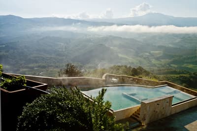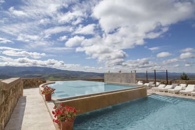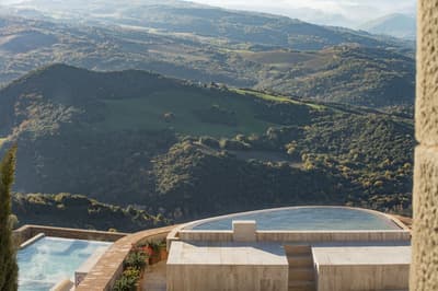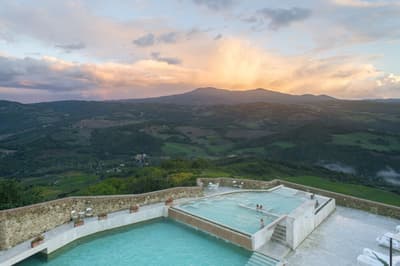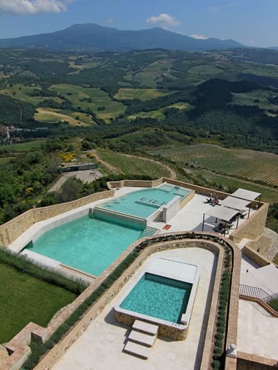 Forteresse du XIe siècle, thermes à l’eau de source souterraine volcanique, domaine viticole produisant du Brunello di Montalcino… Tout ça sur un site classé patrimoine Unesco – le magnifique Val d’Orcia. Non, vous ne rêvez pas ! Le Castello di Velona Resort combine bien-être holistique et immersion dans le fascinant monde du vin toscan. Depuis les deux piscines extérieures en enfilade, vous avez une vue plongeante sur la vallée, couverte de forêts de chênes, d'oliveraies et de vignes. Hop, petit tunnel pour rejoindre la piscine intérieure... Direction l'OliSPA pour vous faire chouchouter sur 1500m2 ! Bains turcs, sauna panoramique, fontaine de glace et douches chromothérapie n’attendent que vous. Vous craquez bien évidemment pour un rituel Brunello, what else ! Le gommage visage et corps à base de raisin et de cassonade nettoie votre peau en profondeur. Le massage avec une crème riche aux extraits de vin enivre votre épiderme et le rend carrément voluptueux... Douce tentation ! Et après le vin sur la peau, il faut bien le savourer... Cap sur le cloître intérieur, véritable centre névralgique du Castello, avec son dôme en verre ! Ici, vous dégustez les meilleurs millésimes, produits sur quelque 5 hectares entourant le château. Et enfin, vous profitez des derniers rayons du soleil depuis la terrasse du restaurant gastronomique Settimo Senso, orientée plein ouest. #SweetTemptation