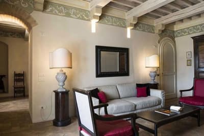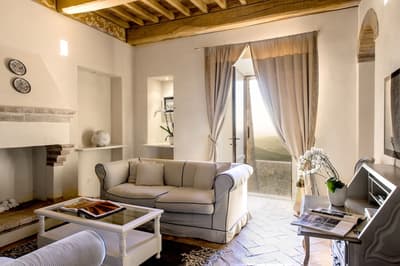 Élégant et chaleureux, elle comporte des sols carrelés en terre cuite, des poutres apparentes typiques de la Toscane et une cheminée. Pour vos moments festifs, vous pourrez prendre votre apéritif dans le salon séparé avec canapé et sièges. La chambre est dotée d’un lit confortable avec matelas Simmons et la salle de bains en marbre est équipée d'une douche dans la baignoire ou seulement d'une douche et d'une seule vasque. Ambiance médiévale !