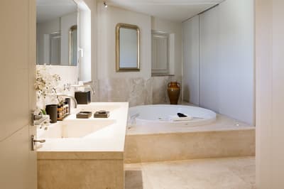 Élégante et raffinée, elle comprend un mobilier de style toscan d'origine Castle, un sol en terre cuite et se complète harmonieusement dans des tons neutres. La chambre est dotée d’un lit king size avec matelas Simmons et la salle de bains spacieuse moderne en travertin est équipée d’une douche séparée du bain à remous. Ambiance médiévale !