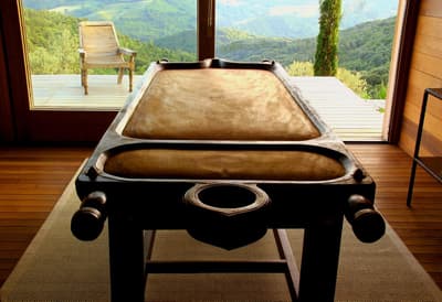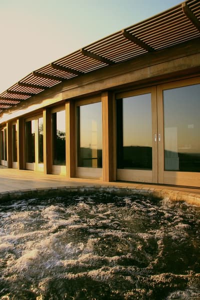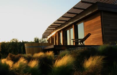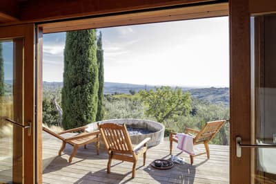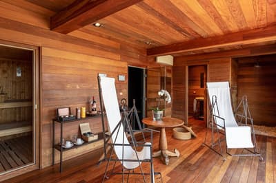 Spacieuse, elle est conçue en bois et en verre et dispose d’un bain turc, sauna et bain à remous extérieur créé à partir d’un tonneau de vin en chêne. La chambre est dotée d’un lit king size confortable et les deux salles de bains en bois sont équipées d’une douche de pluie, sauna et hammam. Ambiance zen !