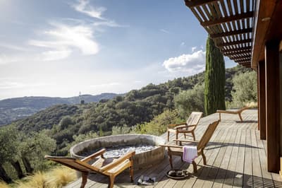 Pleine de caractère, elle est parfaite pour une escapade romantique et est située au-dessus de la piscine à débordement. Elle offre une vue imprenable sur la vallée vers la mer que vous pourrez contempler en toute intimité dans les transats tout en profitant du soleil.
