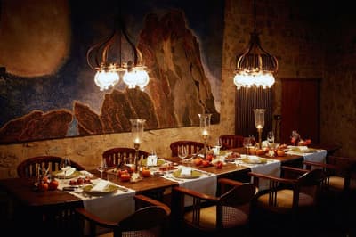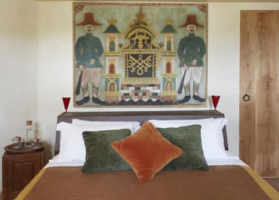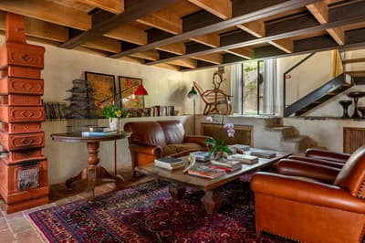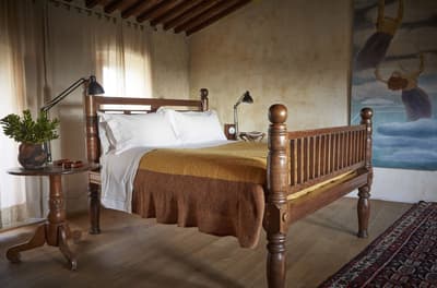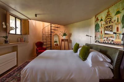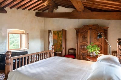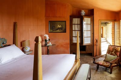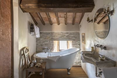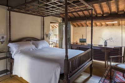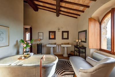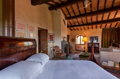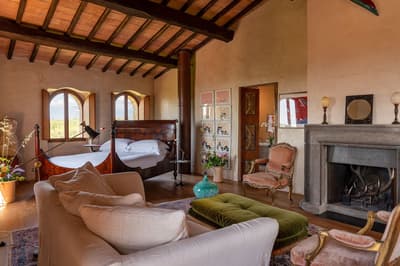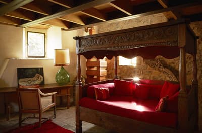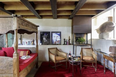 Spacieuse, elle est entourée d’œuvres d’art uniques, d’un salon spacieux avec cheminée et d’un toit toscan traditionnel. La chambre est dotée d’un lit king size et un lit bébé est également disponible. La salle de bains spacieuse est équipée d’une baignoire en marbre italien, d’un double lavabo et pas de douche. Ambiance médiévale !
