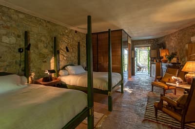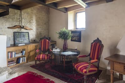 Spacieuse et chaleureuse, elle comporte une cheminée en pierre, un sol carrelé en terre cuite, un canapé antique et se complète harmonieusement dans des matières et des accessoires nobles. La chambre est dotée d’un lit king size et la salle de bains indépendante est équipée d’une baignoire au centre de la pièce avec cabine de douche. Ambiance zen !