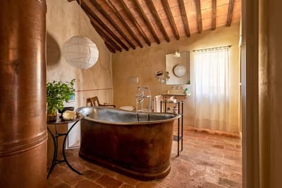 Elle arbore un design traditionnel toscan et comprend des planchers de bois d’olivier, un mobilier haut de gamme et se complète harmonieusement dans des matières et des accessoires nobles. Elle comporte également une cave privée pour vos moments festifs. La chambre est dotée d’un lit king size et la salle de bains spacieuse est équipée d’une douche et baignoire indépendante et d’une collection d’art moderne. Ambiance zen !
