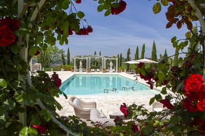 Empruntez la longue avenue, bordée de cyprès et vigne... A l’horizon, un enclos où galopent librement des chevaux. Voilà le Relais Sassa al Sole qui se détache sur la plus haute colline, surplombant la vallée ! Il aura fallu cinq ans pour restaurer cette résidence du 19e et la transformer en adresse chic. Le style Belle Epoque de la villa frôle le kitsch... mais n’y succombe pas. Vous, par contre, vous allez craquer pour les magnifiques fresques à l'intérieur, et pour les jeux d’eau et les statuettes qu'on croise un partout dans le jardin. La villa, aux tons vert sauge et crème, se fond dans les couleurs vives des 20 hectares d’oliviers et de vignes environnants. Sans oublier un doux délire chromatique et olfactif sur le "sentier des amoureux", où poussent quelque 800 roses ! Et sinon, le relais tire son nom du pavé en pierres blanches de la terrasse panoramique accueillant foyer et piscine. Vous trouverez même un jacuzzi au beau milieu du jardin. Un cadre presque surréaliste, top instragrammable au sunset ! Et que dire du spa Otium... Une véritable ode à l’oisiveté, où les influences arabes côtoient les velours opulents. Tons chauds et parfums d'encens et de myrrhe vous accompagnent dans ce parcours sensoriel. Bain turc, sauna, baignoires à remous et chromothérapie... Oh dolce farniente ! Ressentez la Toscane sur votre peau avec un des massages signature à l’olive, à la rose ou au raisin. Décrochage garanti dans la chambre du silence... avec sa cascade !