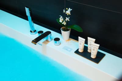 Idéale pour des vacances de luxuriante sérénité, elle profite d'une cabine double avec douche et baignoire d'hydromassage toutes deux équipées de chromothérapie à proximité du lit double très confortable.