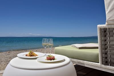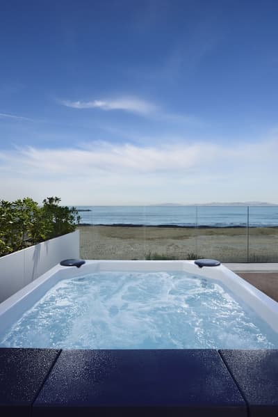 Cette magnifique chambre invite à la détente totale avec sa vue exceptionnelle sur la mer que vous pourrez contempler de la terrasse avec table et chaises, tout en sirotant votre cocktail préféré. À noter que certaines chambres disposent d’une douche avec vue sur la mer.