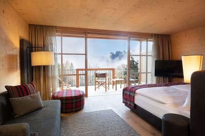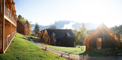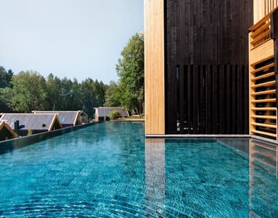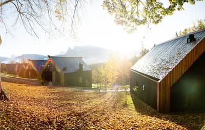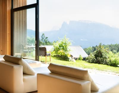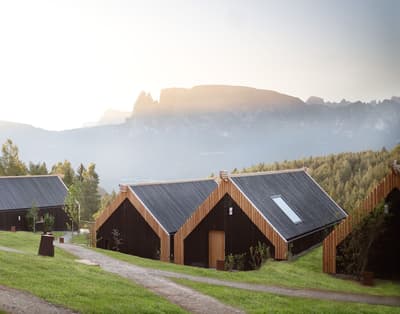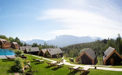 Surplombant la vallée, avec une vue imprenable sur les Dolomites, l’Adler Lodge Ritten revisite le concept du châlet alpin. En plus d’un bâtiment principal, il s’entoure d’une vingtaine de lodges ultra-design. Le mot "lodge" d’ailleurs, n’est pas seulement un effet d’annonce. En effet, la référence aux safaris africains est bel et bien présente. Certains éléments décoratifs sont surprenants, comme ces têtes d'aigle, de dragon et de hibou stylisées et ces motifs totémiques qui viennent colorer des pans de bois, matériau ici omniprésent. Et à défaut de lions ou de girafes, vous croiserez non seulement des cerfs et des chamois, mais aussi des lamas ! Autour de l’étang, pas d’éléphants mais de superbes cabanes de massages… D’autres, sur pilotis, sont immergées au beau milieu de la forêt de mélèzes. L’une d’elles abrite aussi le sauna bio aromatique. Insolite, l’eau de la piscine intérieure est salée ! A l’extérieur, la piscine à débordement fait face au massif Sciliar, qui se teinte de rose au soleil couchant. Mais vous pourrez leur préférer cette cascade revigorante à proximité, en plein été bien-sûr !