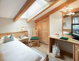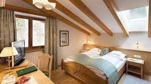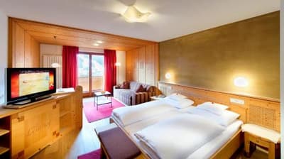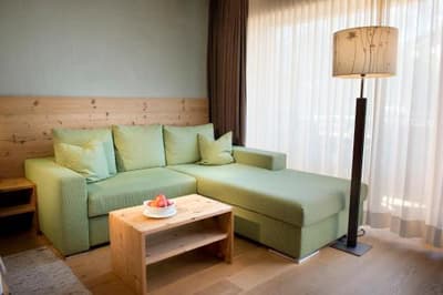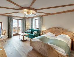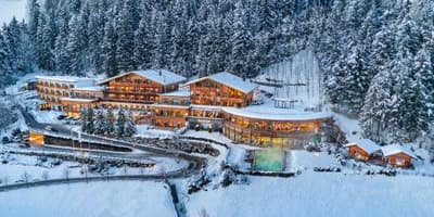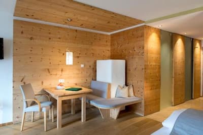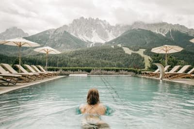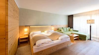 Posé à flanc de montagne, le Naturhotel Leitlhof domine le charmant village de San Candido. Vous êtes à 1200 mètres d’altitude, entre clocher et sapins. Des chalets contigus accueillent les chambres alors que le spa, en contrebas, fait l’objet d’une structure à part, semi-circulaire, tout bois. Étonnant ! Son toit-terrasse végétalisé plonge dans la piscine - chauffée bien-sûr ! -, avec en perspective les Dolomites. Vous aurez comme l’impression de flotter dans le paysage. Ce dernier est d’ailleurs partout, car les bâtiments multiplient les baies vitrées et les balcons. Les intérieurs privilégient le bois clair, tant au niveau de l’habillage que du mobilier. Pas de chichi côté déco. Seules quelques impressions florales s’invitent sur les lambris et les carreaux sur la laine des sofas, des coussins et des rideaux, avec juste ce qu’il faut de couleur et de chaleur pour s’y plaire au retour de randonnées ou de descentes à ski. Le paysage est bien la star de ce complexe et les ressources de la nature environnante, les meilleures raisons de séjourner ici… Vous vous laisserez séduire par les vertus de l’arôme du pin, et galvaniser par celles des plantes d’altitude, tamponnées dans le cadre d’un massage.