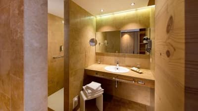 Spacieuse, elle profite d’une vue exceptionnelle sur les montagnes que vous pourrez contempler depuis le confort de votre chambre en toute intimité. Située dans le bâtiment principal, elle dispose de toutes les commodités pour des vacances agréables.