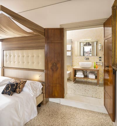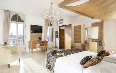 A deux pas du Grand Canal et de la place Saint-Marc, l’Unahotels Ala Venezia vous ouvre les portes de l’âme vénitienne... Descendez du vaporetto, marchez 40 mètres, et vous découvrez le bâtiment du 18e siècle, élégant avec sa couleur ocre et ses volets vert forêt, qui abrite la maison-mère sur une jolie placette. Car l’hôtel a la particularité d’être composé de 3 lieux différents. Dans la maison-mère, vous avez le bonheur de vous hisser sur une terrasse géniale qui vous offre un panorama à couper le souffle sur la ville. Posez vos valises tout de suite si votre chambre se trouve dans ce bâtiment, et sinon, marchez entre 30 et 80 mètres pour rejoindre l’annexe qui vous accueillera pour votre séjour. Le fil conducteur de tout ça ? Venise, baby ! Côté déco, tout est pensé pour vous immerger dans la Sérénissime, des boiseries préservées aux moulures élégantes, sans oublier l’incontournable style baroque aux élans rococo… Certaines chambres offrent même une vue splendide sur le Grand Canal : c’est le cas des chambres Exclusives de l’annexe, qui se trouve dans un ancien palazzo. Et l’esprit baroque se diffuse même jusqu’au bar à cocktails, décoré avec des éléments du théâtre de La Fenice, rien que ça ! Enfin, un élément important à prendre en compte : l’hôtel n’accepte pas les enfants de moins de 16 ans, ce qui en fait une escale parfaite pour les couples en quête de sérénité et de romantisme !