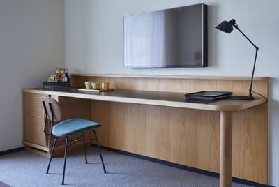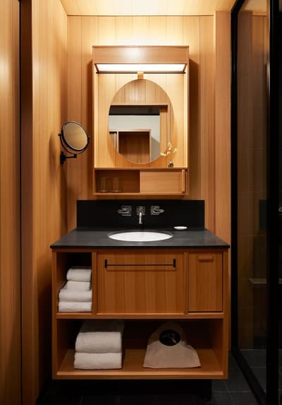 Dans un style résolument minimaliste et soigné, elle arbore une belle moquette au sol, un mobilier tendance et se complète par des œuvres d’art originales de Samiro Yunoki et une couverture Pendleton personnalisée. La chambre comprend des lits king-size avec une literie de qualité. La salle de bains est dotée d’ardoise et de bois de frêne naturel et est équipée d’une baignoire japonaise et d’une douche séparée. Le tout dans une atmosphère conviviale !