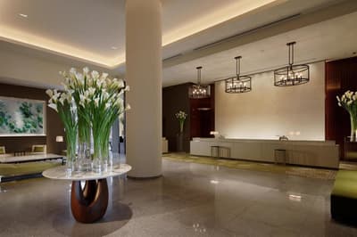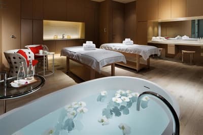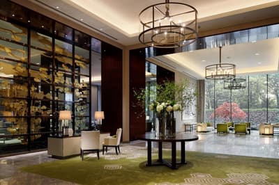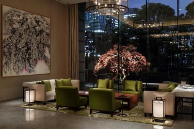Au Palace Hotel Tokyo, c’est la belle vie qui vous attend dans un lieu historique ! Rien qu’à l’extérieur, ça claque déjà avec ces fontaines et ces jets qui s’élancent des bassins, car oui, vous êtes aux portes de l’incroyable jardin du palais impérial de Tokyo ! Magique ! Le lieu abritait auparavant le bureau forestier la maison impériale avant d’être converti en hôtel en 1947, totalement reconstruit en 2009. Dès l’entrée, vous avez l’impression d’arriver dans un véritable palais avec ces marbres et ces grands espaces, ces lustres majestueux et traditionnels. Avec ces murs tout en transparence qui laissent apparaître des motifs d’arbres japonais ou carrément les murs et la végétation verdoyante de l’extérieur. Prenez le temps de vous asseoir à l’un des bars de l’hôtel ! Comme au très nostalgique Royal Bar, avec ses banquettes bordeaux, où le comptoir en marbre de Monsieur Martini a été conservé après la reconstruction de l’hôtel en 2009. Et vous allez aussi halluciner sur la collection d’un millier d’oeuvres d’art de l’hôtel qui peuplent chaque mur de l’hôtel ! A l’image de la toile blanche texturée disposée derrière le lobby, cristallisant les fleurs menacées au Japon. Bref, un hôtel vraiment impressionnant où le luxe règne en maître !