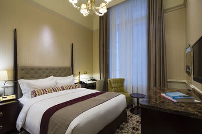 Chaleureuse, elle arbore des hauts plafonds, des fenêtres verticales rappelant les classiques européens, une belle moquette au sol, un mobilier classique et se complète harmonieusement dans des tons apaisants. La chambre est dotée de lits jumeaux avec une literie de qualité et la salle de bains en marbre est équipée d’une baignoire et douche. Le tout dans une atmosphère conviviale !