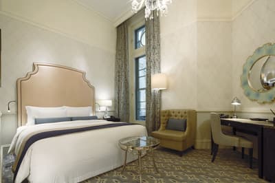 Chaleureuse, elle arbore des hauts plafonds, des fenêtres verticales rappelant les classiques européens, une belle moquette au sol, un mobilier classique et se complète harmonieusement dans des tons apaisants. Après une longue journée d'activités, vous pourrez vous reposer dans le lit queen confortable avec une literie de qualité. La salle de bains en marbre est équipée d’une baignoire et douche. Le tout dans une atmosphère conviviale !