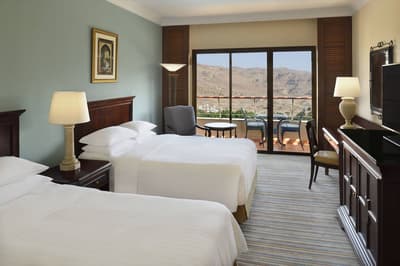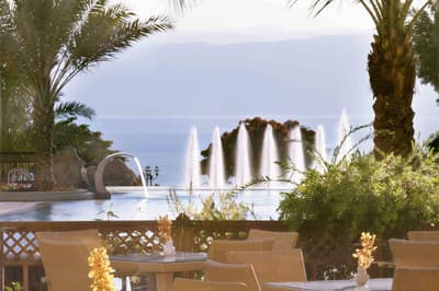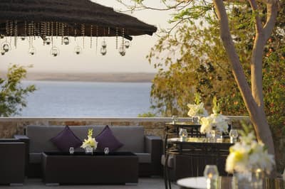 Lire son journal en flottant dans la mer Morte, les pieds en éventail, voilà une expérience à vivre au moins une fois ! Mais barboter dans l’eau sans pour autant se retrouver les fesses en l’air au moindre faux mouvement, c’est aussi possible au Dead Sea Marriott Resort & Spa. Ce resort est un véritable paradis de piscines, de fontaines et de jacuzzis, de petits ponts, de rochers et d’une végétation exotique, de palmiers, de pins et de bougainvilliers. Avec tous les transats à dispo, le spa et ses soins revigorants, mais surtout la possibilité de se tartiner de boue face à une mer légendaire : l’ambiance est à la détente et à l’évasion ! Et ça se ressent dès l’arrivée, après le contrôle de sécurité — passage obligatoire dans les hôtels de Jordanie — opéré par un employé chaleureux. Quel magnifique lobby ! Surtout à la nuit tombée, quand l’éclairage illumine les grands bambous, et que le lustre suspendu et les petites lumières sur les tables offrent une ambiance tamisée à l’ensemble. Les chambres, dans des tons de jaune ou de bleu pastel, avec des meubles et des volets intérieurs en bois foncé, dévoilent un esprit feutré. Mais le clou du spectacle, c’est quand même la vue sur la mer Morte !