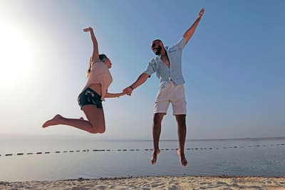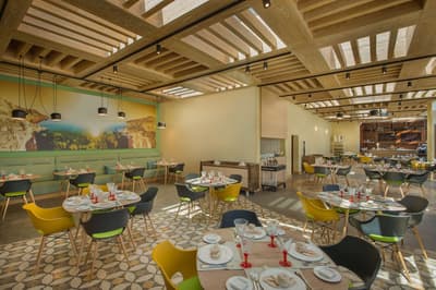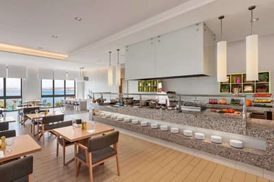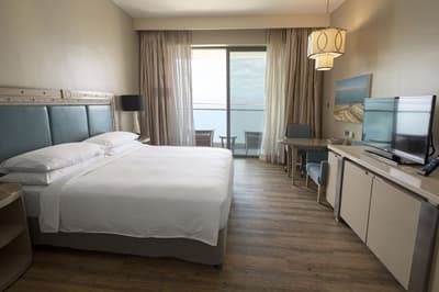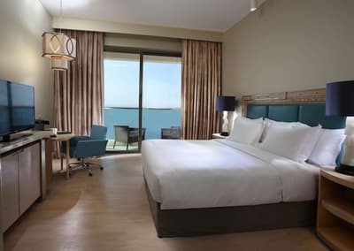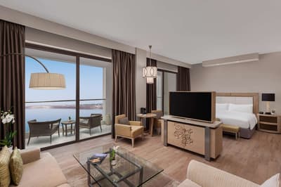 Le blanc et le beige poudré du sel qui se cristallise sur les rives, le bleu du ciel en écho avec celui de l’eau, le rose des montagnes qui se dessinent au loin : on retrouve les couleurs uniques de la mer Morte dans les chambres du Hilton Dead Sea Resort & Spa ! Que ce soit sous la forme d’une tête de lit, d’une lampe ou d’un tableau représentant ce joyau de Jordanie. C’est bon, on est dans le bain. Tout au bord de la mer Morte, point le plus bas sur Terre, cet hôtel a la chance de posséder un accès plage. Le rituel « spa » ici est naturel, on s’enduit de boue avant ou après la floating therapy ! Ensuite, on s’allonge sur l’un des transats qui ressemblent à des bananes ou des pirogues, selon l’imagination du jour. Pour le petit plus, sachez qu’il est possible de s’offrir un massage avec vue sur ce paysage ! Avec ça, vous devriez flotter aussi sur un nuage. Pour vous délasser dans l’eau un peu plus longtemps que les 20 minutes prescrites pour la mer Morte, direction le swim-up bar. En général, on adore ce qui est swim-up et cette piscine avec palmiers, tabourets immergés et offre de boissons en tout genre ne fait pas exception à la règle. Mais on aime aussi le beach bar de cet hôtel et, plus haut, les salons éparpillés en terrasse, promesses de moments romantiques.