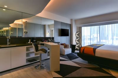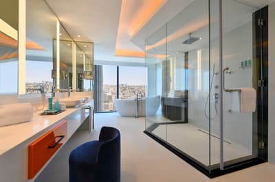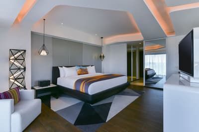 Elle bénéficie d’une décoration luxueuse et comporte une belle moquette au sol, un mobilier tendance et se complète par des accessoires design. Après vos activités, vous pourrez vous détendre dans le salon et vous divertir devant la télé. La chambre est dotée de deux lits jumeaux avec matelas à plateau-coussin et la salle de bains en marbre est équipée d’une douche de forêt tropicale avec des produits Bliss® Spa exclusivement réservés aux clients de l'hôtel W. Le tout dans une atmosphère paisible !