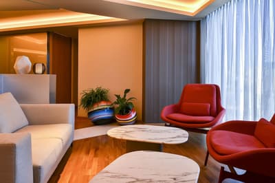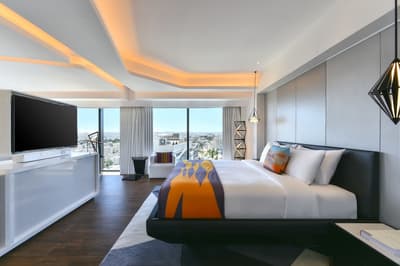 Cette Méga chambre regorge de technologies amusantes et astucieuses et offre une vue captivante sur la magnifique ville d'Amman. Grâce aux grandes baies vitrées, vous pourrez vous détendre dans votre lit et profiter du paysage. À noter qu’une chambre communicante peut être disponible (pour certaines chambres).