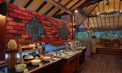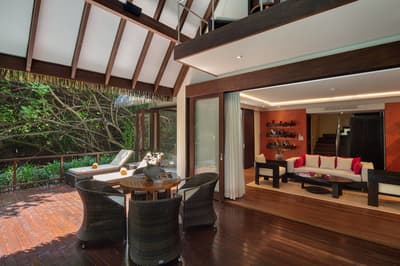 La chambre est élégamment meublée et possède un intérieur en bois créant un cadre chaleureux. La salle de bains améliorée comprend un double vasque et une douche extérieure. Le tout dans une atmosphère sereine !