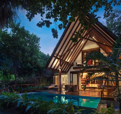 Une île-hôtel avec des villas tout autour, à l’abri de la végétation et en bord de plage. On entend le chant des oiseaux tout le temps, c’est un petit paradis !