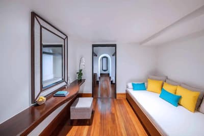 La chambre est spacieuse et comprend un lit double king-size, des lits jumeaux, un beau parquet, un mobilier design et l’ensemble est dans une dominance de blanc. Elle dispose également d’une salle de soins spa pour couples, le tout dans une ambiance tropicale et relaxante !