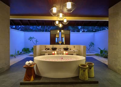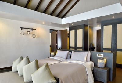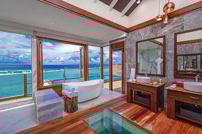 C’est le summum d’une expérience les pieds dans l’eau maldivienne ! Son extérieur est généreux disposant d’une piscine et d’une terrasse aménagée de belles chaises longues et de fauteuils. Elle profite d’une vue époustouflante du lagon turquoise et y offre un accès privilégié. Salle de bain avec panneaux en verre et baignoire.