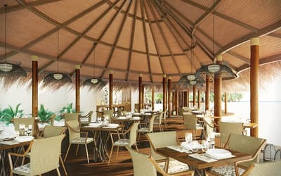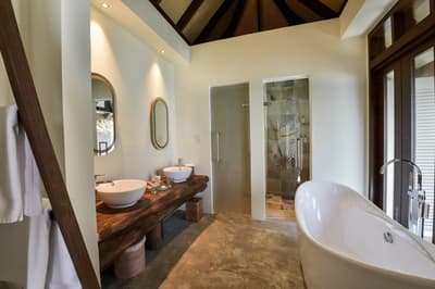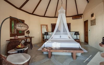 Elle comprend un grand lit king-size avec baldaquin traditionnel en filet et l'ensemble bénéficie d’une décoration chic et raffinée avec un mobilier en bois brut. La salle de bain est aérée et lumineuse avec un double vasque posé sur une table en bois brut, une baignoire avec vue sur l'océan et des produits de toilette biologiques. Le tout dans une atmosphère de luxuriante sérénité!