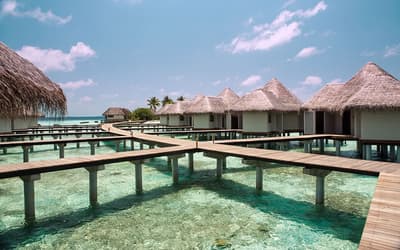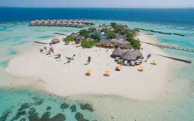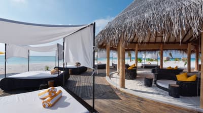 Minuscule confetti de sable nacré (à peine plus d’un hectare) lové au milieu d’un merveilleux lagon émeraude, Thelu Veliga est une île pour déconnecter, où tout tourne autour du monde marin. Des bungalows sur pilotis, quelques coups de palme suffisent pour admirer tortues, raies et bénitiers. Les plus hardis se risqueront à nager avec les requins baleines, qui abondent à quelques encablures de l’hôtel. Propriété d’une famille maldivienne, ouvert en 2015, c’est l’un des plus petits resorts de l’archipel. Loin des grands complexes luxueux, Thelu Veliga égrène ses huttes surmontées de toits de chaume sur le lagon. Ce décor simple et élégant suffit au bonheur. Pieds nus dans le sable, vous apprécierez le silence de l’île, aurez peut-être envie de vous (re)mettre au yoga, oublierez vos soucis sous les mains expertes des masseuses du spa Thémaé, jolie marque française experte de la beauté par le Thé. Pour les agapes, vous apprécierez l’ambiance un peu rustique et chaleureuse du seul restaurant de l’île, jolie cabane en bois, où le buffet aux multiples influences saura ravir vos papilles, avant de rejoindre le bar juste à côté, pour vous perdre dans la contemplation du bleu à perte de vue.