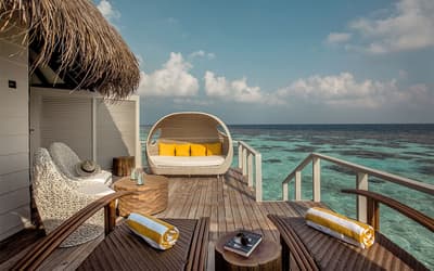 Cette villa sur pilotis bénéficie d’un accès direct au lagon et comprend des sièges extérieurs privés et chaises longues sur la terrasse, d’où vous pourrez vous détendre en toute intimité.