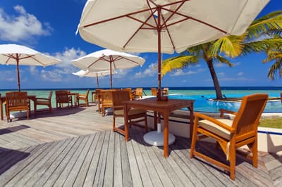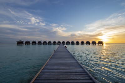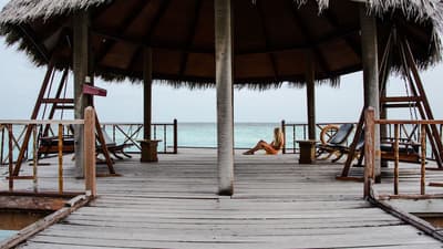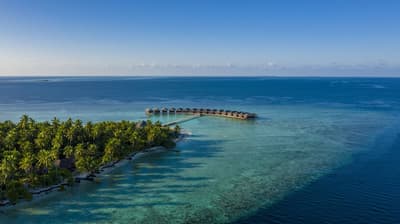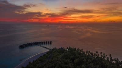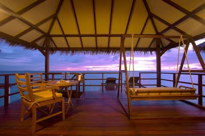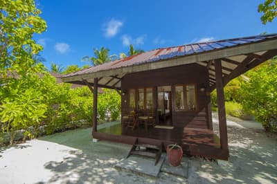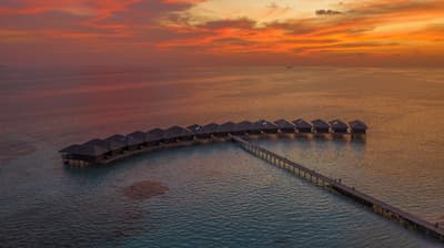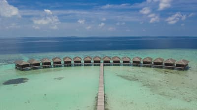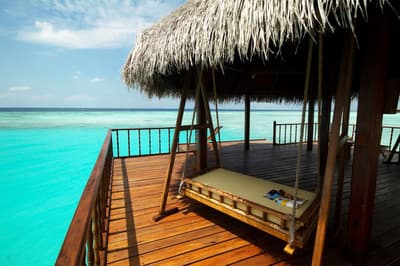 Cette villa très spacieuse installée sur pilotis, offre une vue spectaculaire du lagon turquoise des Maldives. Sa terrasse est aménagée de longues chaises et d’un fauteuil en balançoire idéal pour apprécier de magnifiques couchers de soleil. Elle permet un accès direct à l’eau limpide. Grande salle de bain avec baignoire.