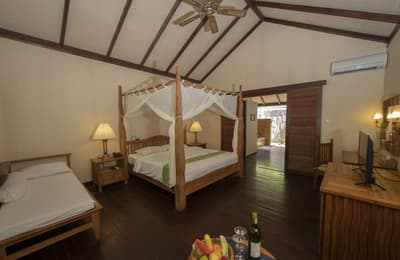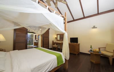 Cette villa indépendante sur le front de mer a les pieds dans le sable. Elle offre une atmosphère paisible et elle est confortable et agréable. Terrasse aménagée avec des chaises et une table. Elle peut accueillir un lit King à baldaquin ou 2 lits doubles. Petit coin salon en chambre avec des fauteuils et une banquette. Grande salle de bain semi-extérieure avec une baignoire et une douche à ciel ouvert.