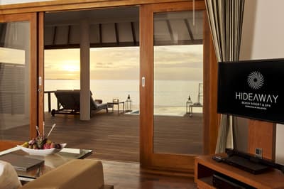 Élégamment meublée, elle dispose d’une salle à manger et d'un salon séparés. La salle de bains, spacieuse, est équipée d'une baignoire jacuzzi, d'une douche à effet pluie et les installations de classe mondiale sont assorties d'un service de classe mondiale au Hideaway Beach Resort and Spa. Une très belle ambiance tropicale !