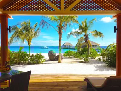 Elle s'ouvre sur un jardin arrière qui mène à une plage tranquille sur le côté lagon de l'île et dispose d’une belle terrasse privée, équipée de chaises longues, face à la mer. Elle est également dotée d’une piscine à débordement.